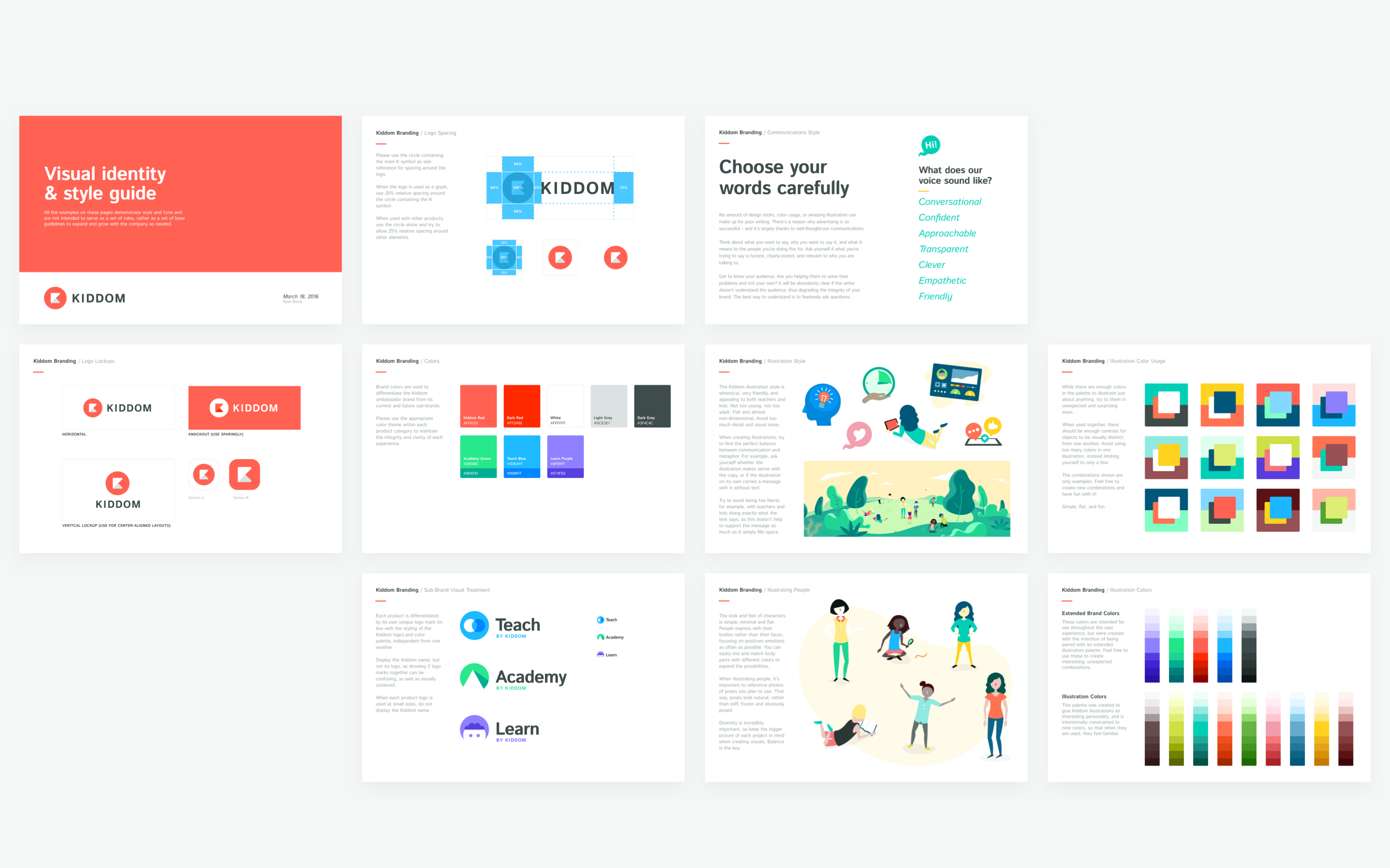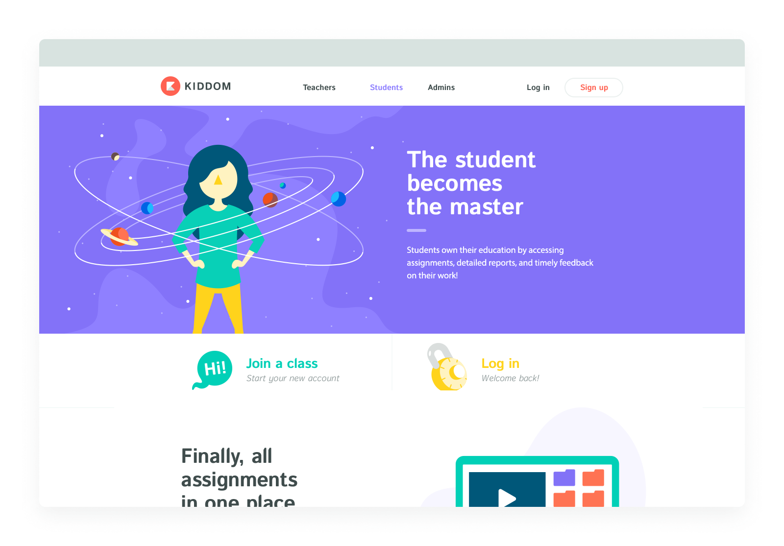 Branding and visual identity of Kiddom is approachable and whimsical, with down-to-earth confidence, appealing to both students and teachers. Vivid colors differentiate it from institutional education tools, and give a more casual and conversational vibe.