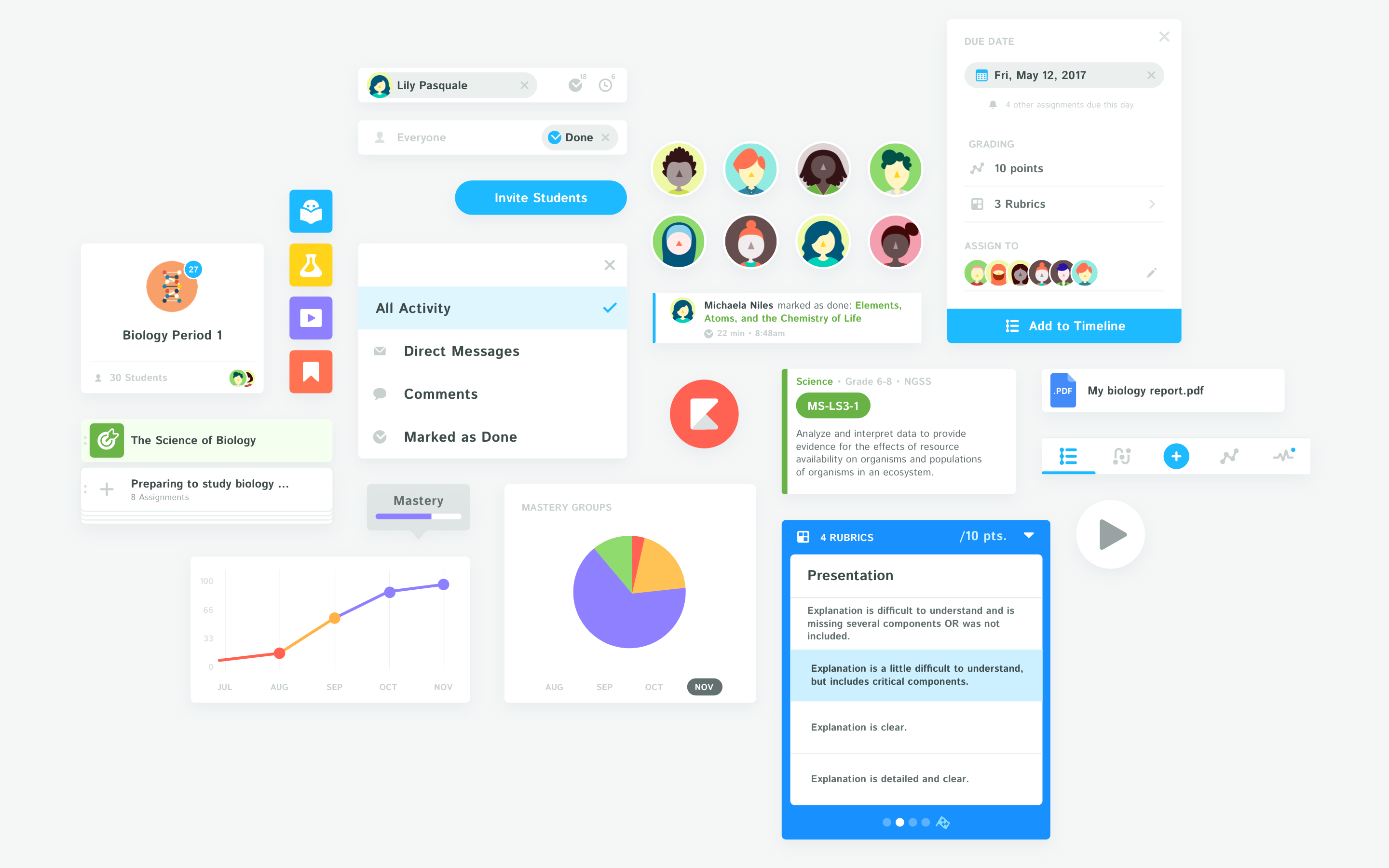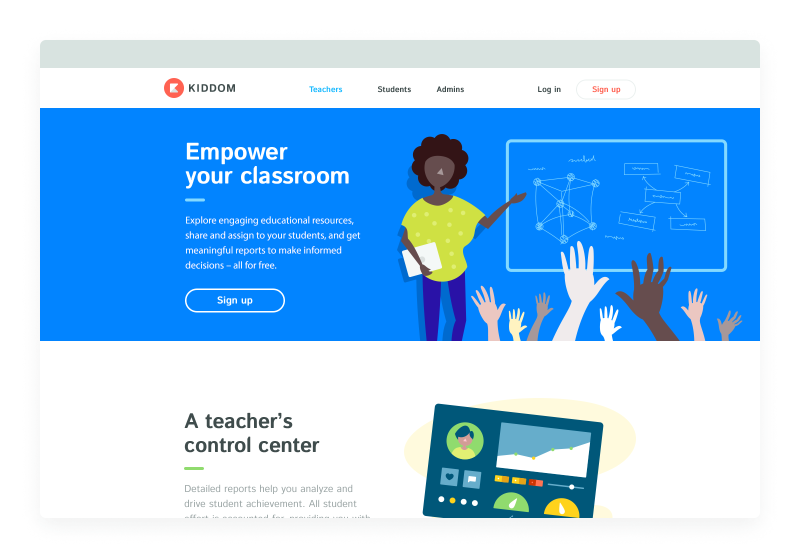 Kiddom is an online platform for delivering quality curriculum to students, at home or in the classroom. While leading design at Kiddom, I developed all-new branding, visual identity, and created a custom UX/UI design system to provide a consistent user experience on all digital platforms.